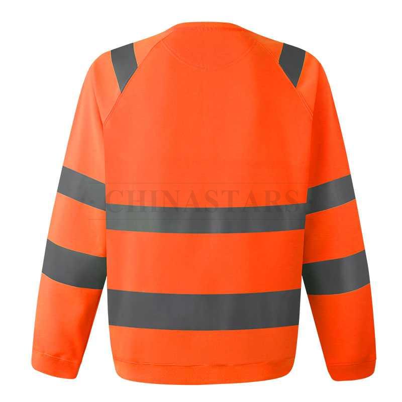 - CSR-SW002 reflektierendes Sweatshirt aus fluoreszierendem Stoff mit zwei Zoll breiten reflektierenden Streifen um den Körper, die Arme und über jeder Schulter, das 360°-Schutz bietet, um die Sichtbarkeit und Sicherheit der Benutzer bei Tag und Nacht zu verbessern.