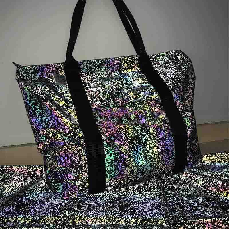 • Bolso tote reflectante con estampado de arcoíris y asas