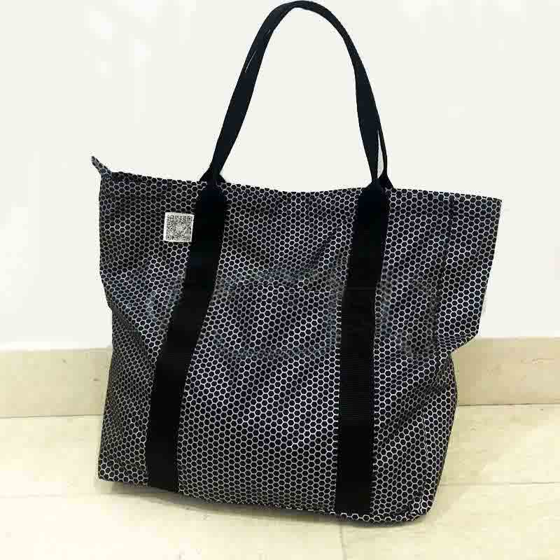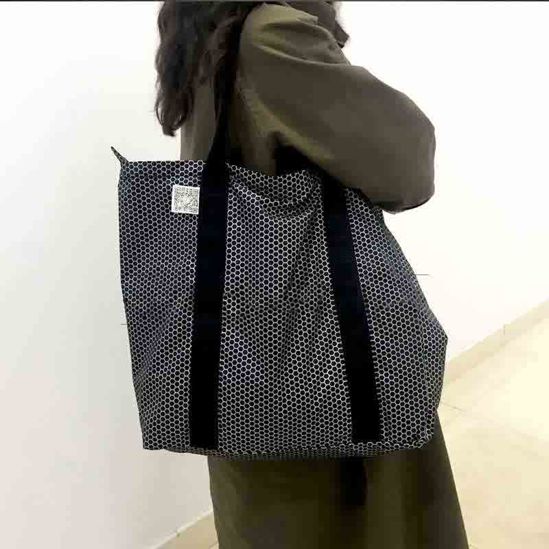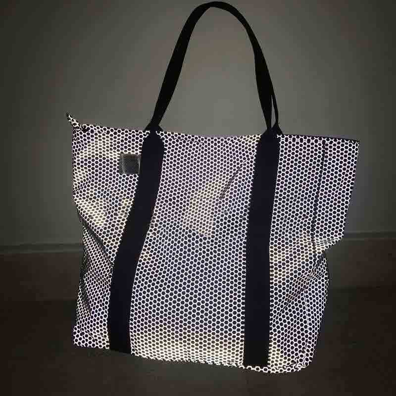 - 1. Esta bolsa está hecha de poliéster con estampado hexagonal reflectante. Aspecto reflectante que ofrece alta visibilidad.