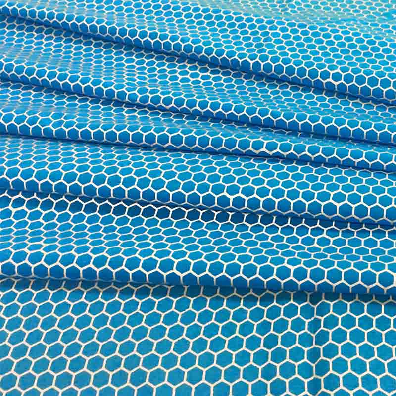 Tela estampada reflectante con patrón hexagonal.